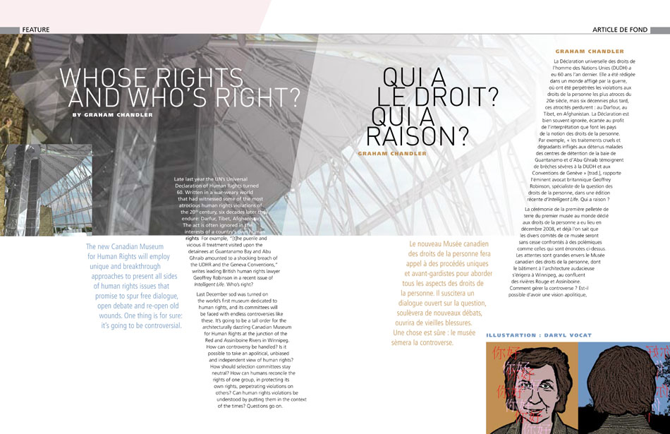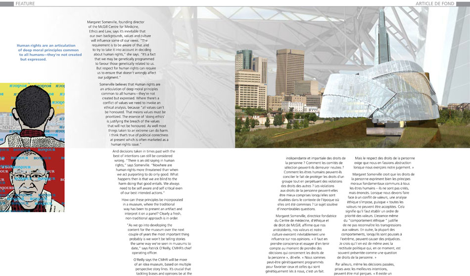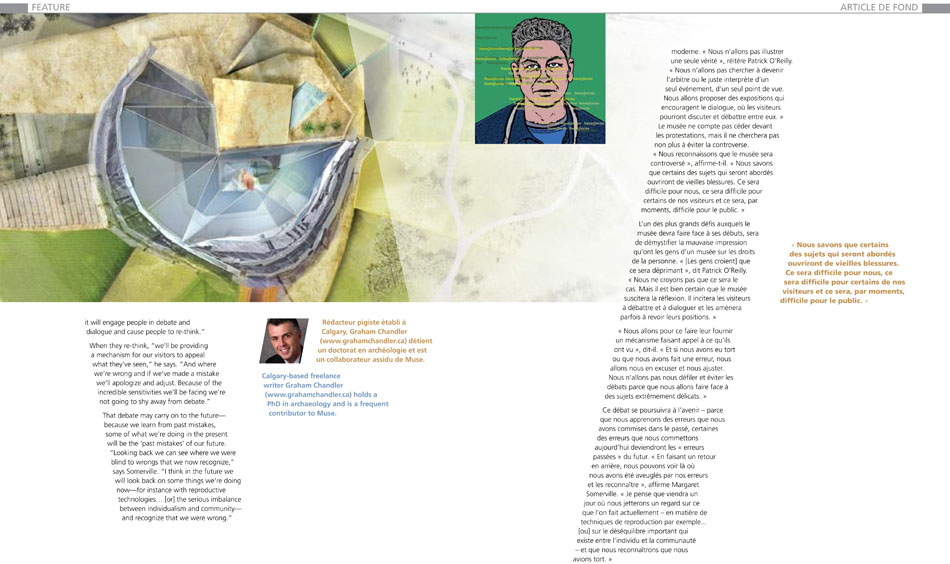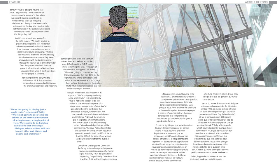 The Canadian Museum Association commissioned Scott as a guest designer for two issues of its flagship magazine Muse. Scott used a very contemporary asymetrical swiss layout to create present both languages in a spacious layout. This layout refelcted the modern content and invited the eye and engaged the reader to explore the subject matter on a deeper level. Scott worked with illustrators to further enhance the feature article.